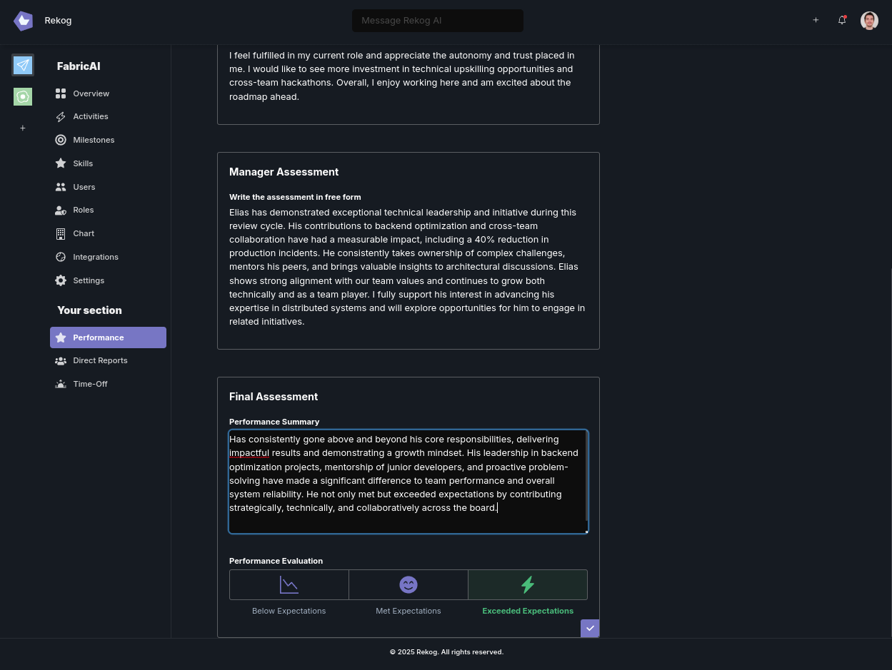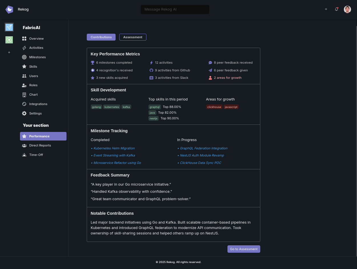 Instead of rummaging through old emails or sprint reports, managers can open an employee’s Rekog profile and immediately see AI-curated highlights:- Skills with the highest growth over the last review period