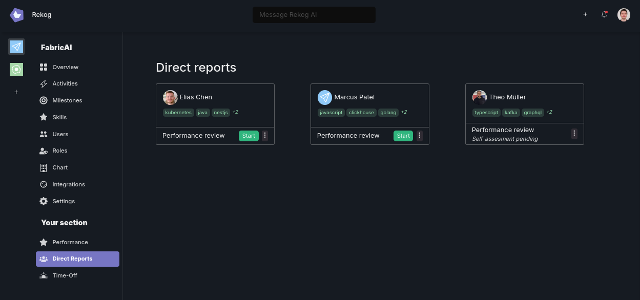 Rekog’s built-in intelligence, known as the Manager’s Copilot, interprets these contributions, highlights key milestones, and surfaces any potential issues. This helps managers quickly pinpoint who might need extra support, who’s ready for a promotion, and where the team stands in terms of skill coverage. -