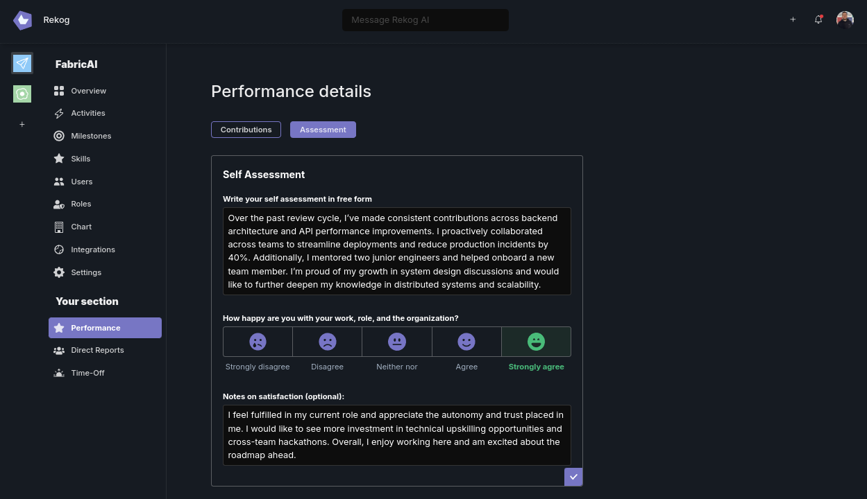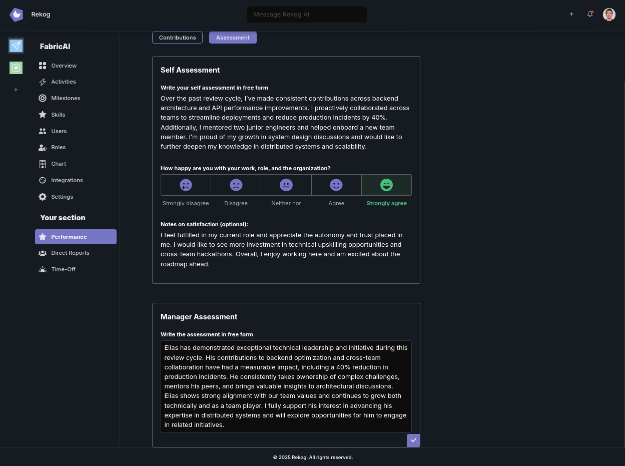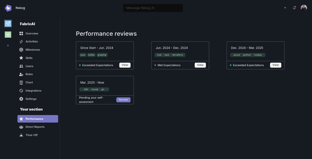 Skills are never static. As an employee’s responsibilities change, or as they pick up new skills at hackathons or open-source projects, Rekog updates their profile automatically. Performance Reviews tap into this evolving skill data to provide a holistic, up-to-date perspective.